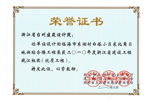 東湖村白塔小區東北角B地塊綜合樓工程獲2010浙江省建設工程錢江杯獎(優質工程)