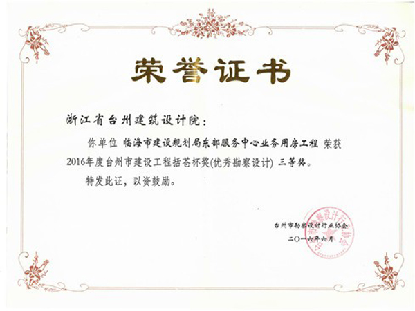 臨海市建設規劃局東部服務中心業務用房工程獲2016括蒼杯獎(優秀勘察設計)三等獎